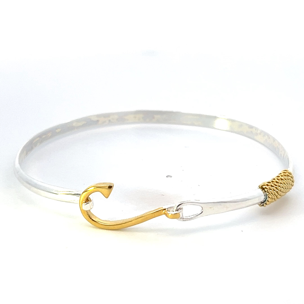 Sleek silver bracelet with a hook clasp and textured accent. A modern, nautical-inspired design that adds bold elegance to any look.